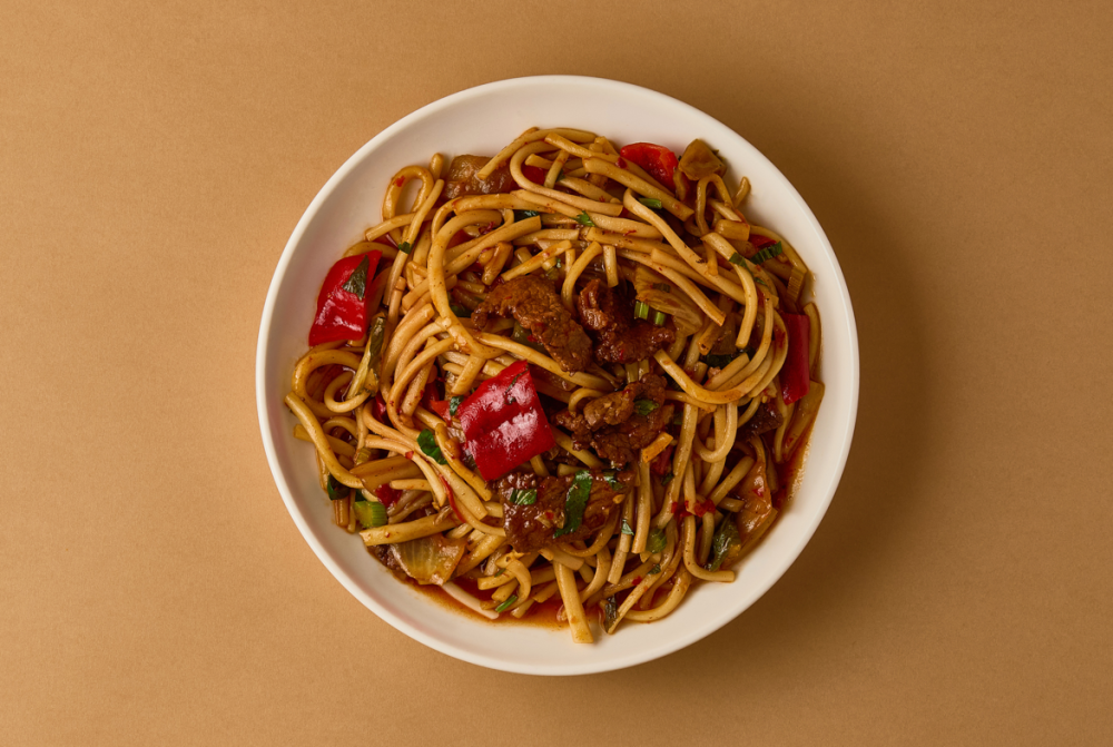 Лапша, обжаренная с мясом и овощами. Сбалансированный вкус и приятная текстура.