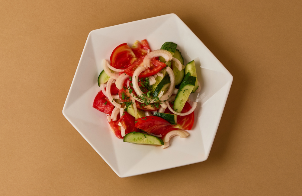 Огурцы, помидоры и зелень, заправленные лёгким маслом. Полезно, просто и вкусно.