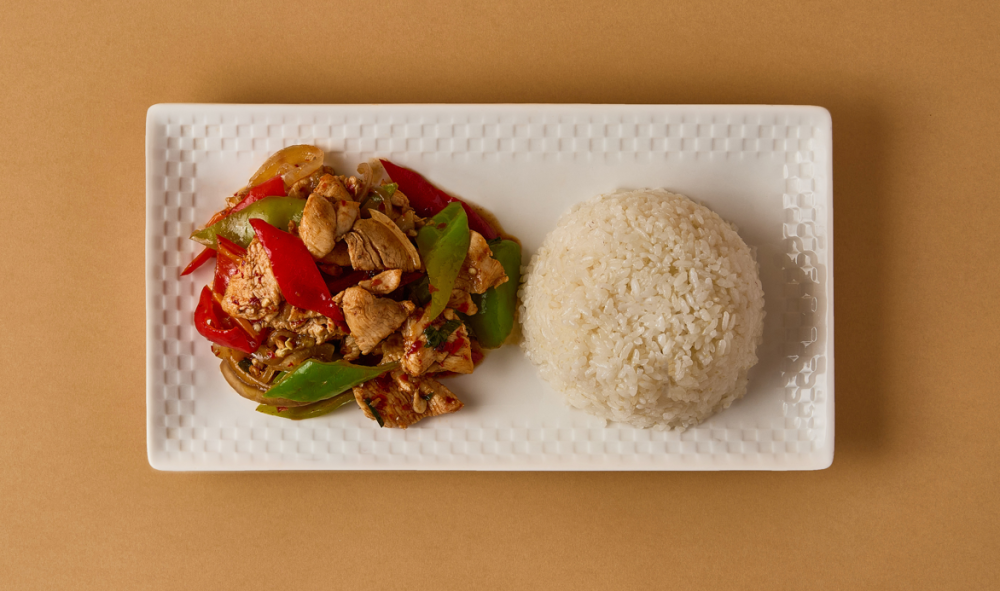 Аппетитные кусочки курицы, обжаренные с перцем и чесноком до лёгкой хрустящей корочки. Подаются с рисом.