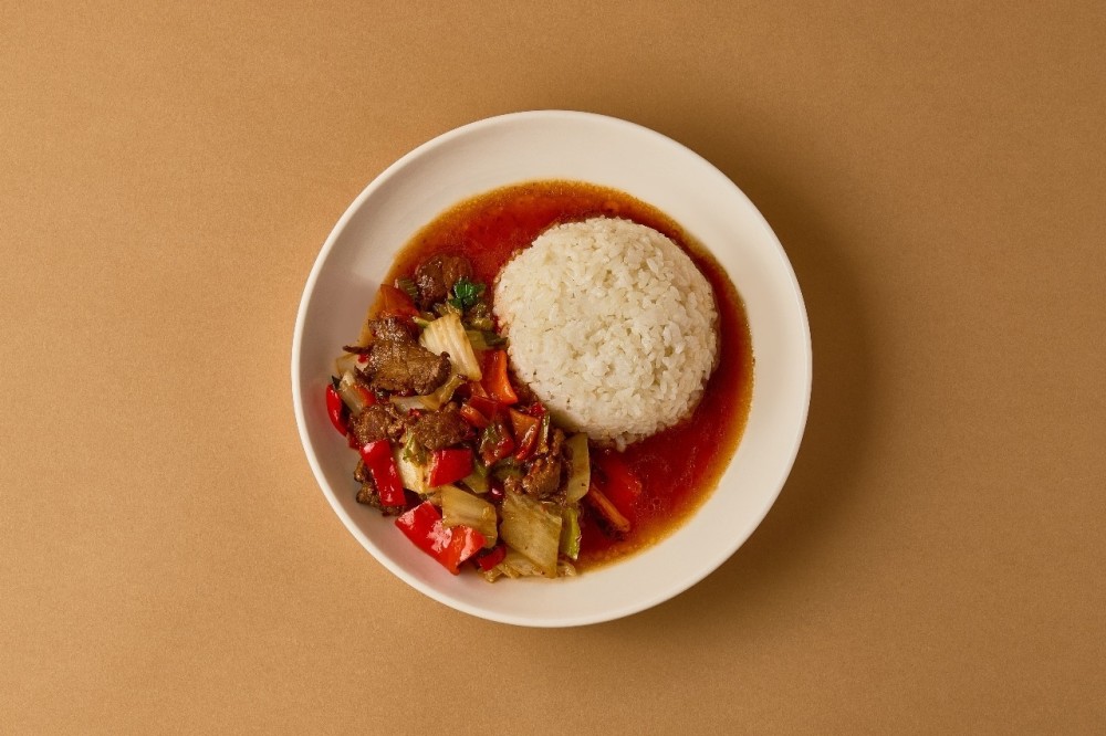 Нежное мясо и овощи в густом соусе с лёгкой остринкой, подаются с рисом. Идеальный вариант для плотного обеда.