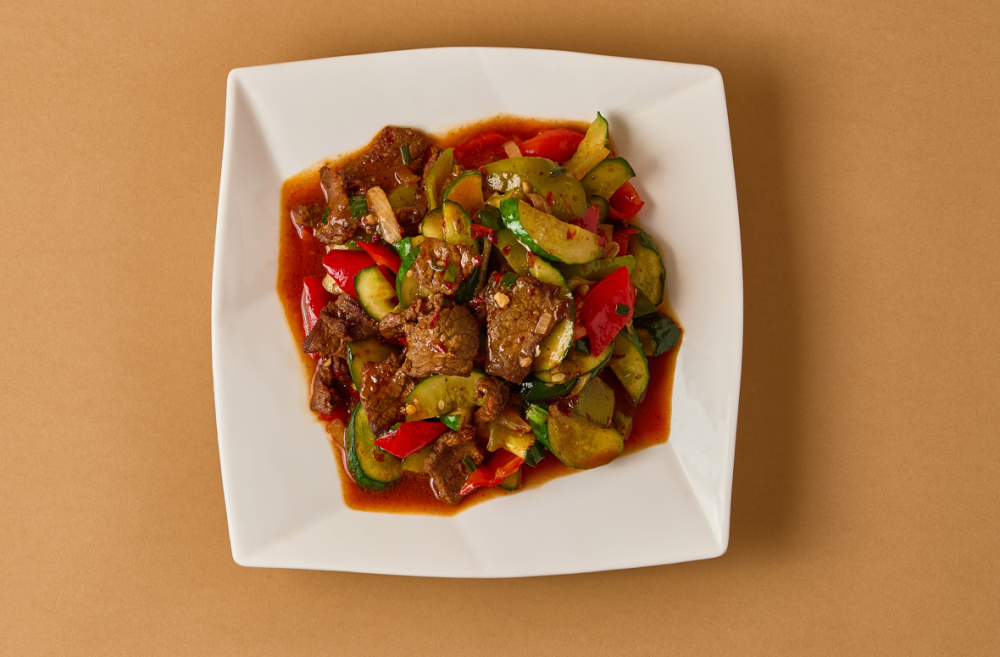 Обжаренное мясо с овощами в сладко-остром соусе. Богатый вкус, в меру пикантно и очень сочно.
