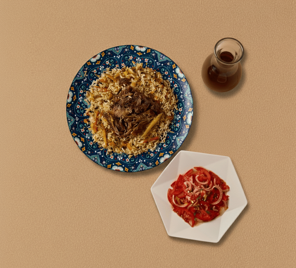 Пятничный дастархан, собранный с теплом и вкусом: ароматный плов праздничный, свежий ачичук и домашний компот яблочный собственного производства (500 мл)