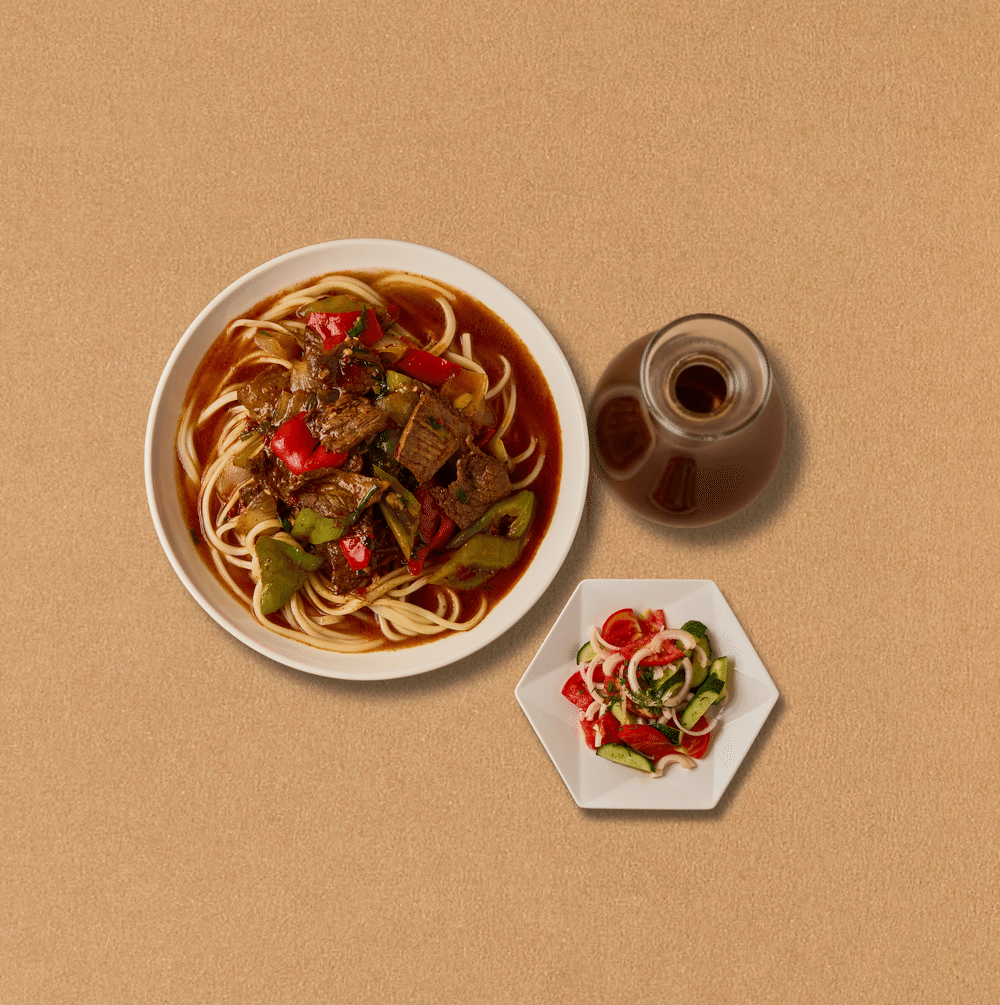 Насыщенный лагман с говядиной, свежие овощи и прохладный яблочный компот собственного производства (500 мл)